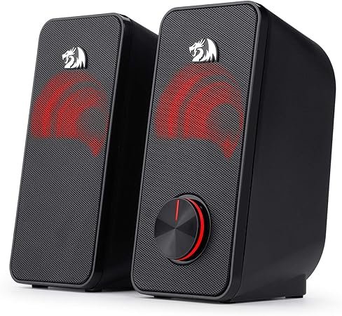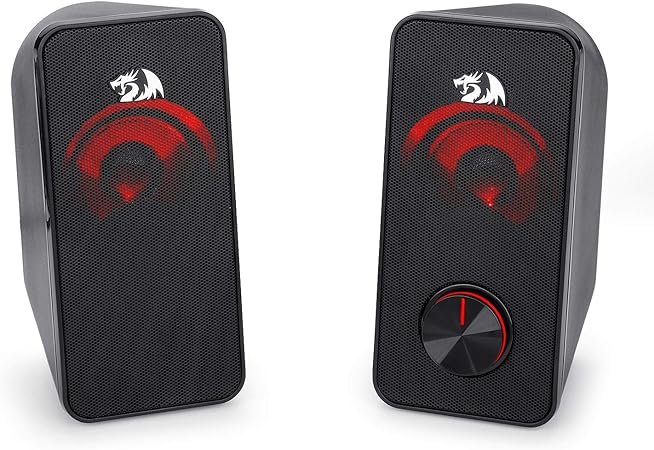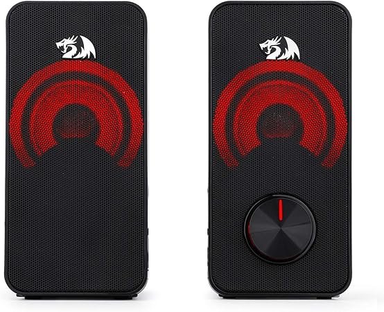A Redragon Stentor GS500 traz um visual agressivo, típico da linha gamer da marca. Com iluminação LED vermelha, ela se destaca na mesa e combina com setups mais ousados. Cada caixa possui 5W de potência, totalizando 10W RMS, suficiente para uma boa experiência em jogos, vídeos e músicas.