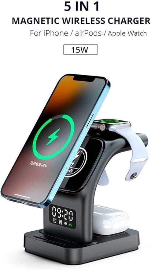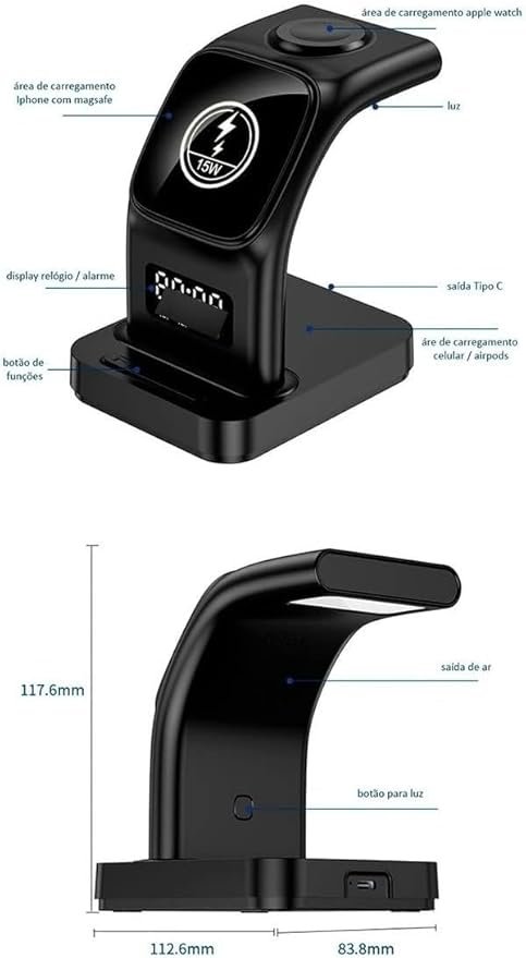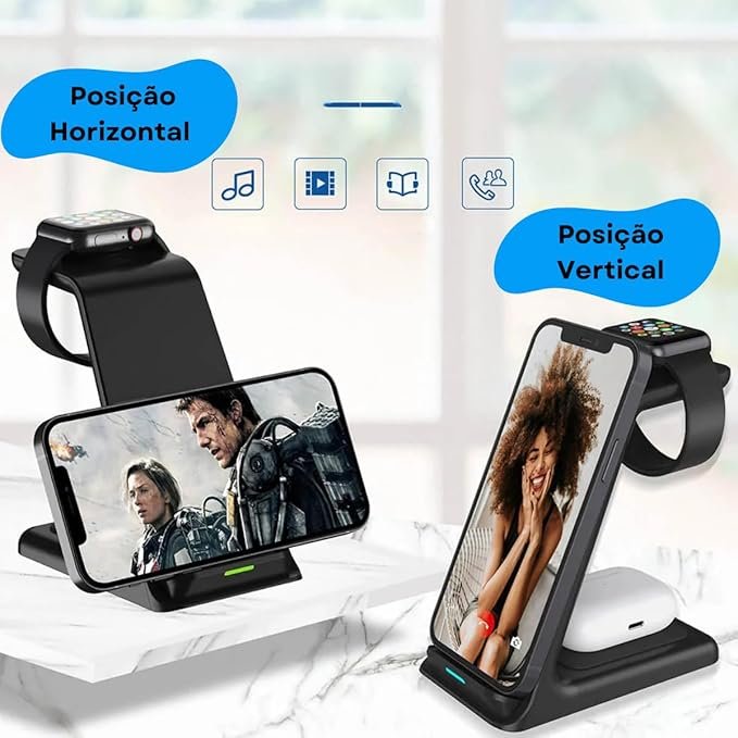 O Carregador Sem Fio 3 em 1 é uma solução prática e eficiente para quem tem dispositivos Apple, como iPhone, iWatch e AirPods. Compatível com modelos como iPhone 15, 14, 13, 12, 11, e mais, ele permite carregar até três dispositivos simultaneamente, sem a necessidade de cabos.