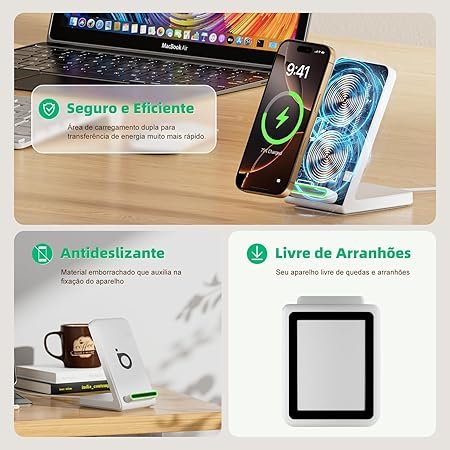 Além disso, o carregador é fácil de usar e ocupa pouco espaço, ajudando a manter seu local organizado. A estação 3 em 1 proporciona a praticidade de carregar vários dispositivos ao mesmo tempo, sem bagunça de fios.