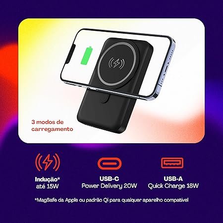| Compatibilidade | Funciona com qualquer dispositivo com carregamento Qi por indução ou via cabo USB-C/USB-A |