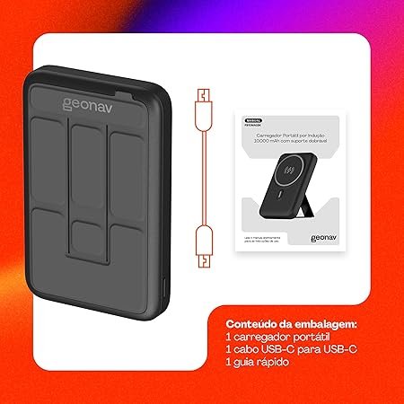 Se você está em busca de praticidade e mobilidade para recarregar seus dispositivos durante o dia, o carregador portátil da Geonav com 10.000mAh é uma solução moderna, eficiente e cheia de recursos úteis. Com suporte magnético compatível com MagSafe, ele fixa-se facilmente à traseira do iPhone, oferecendo carregamento por indução sem necessidade de cabos ideal para quem está sempre em movimento.