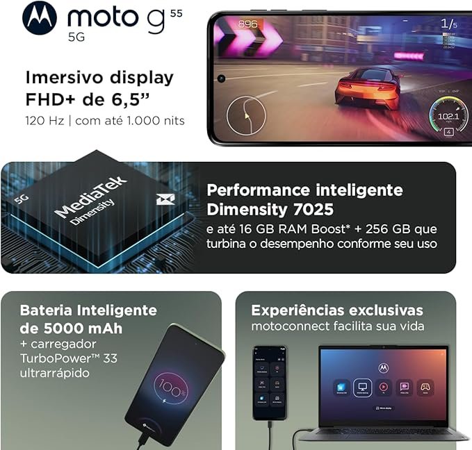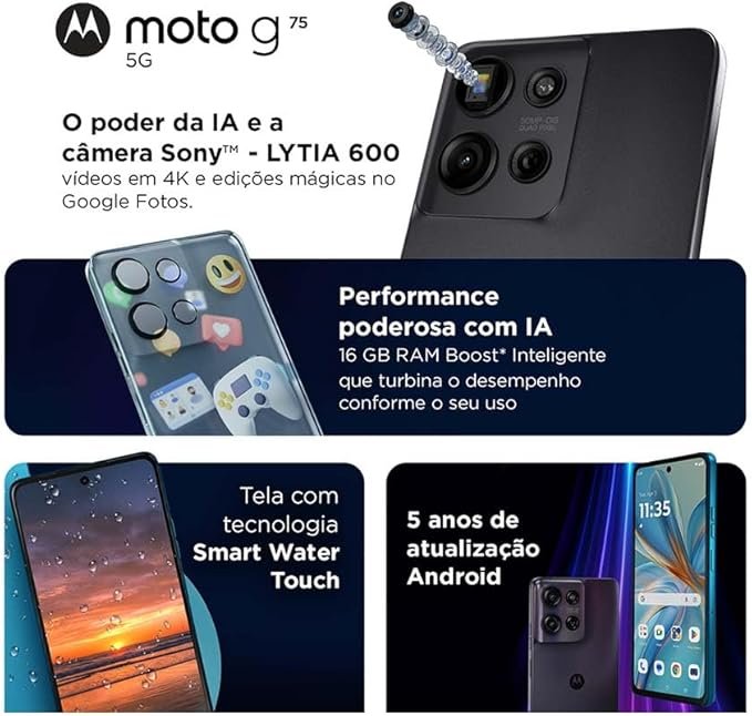 O Motorola Moto G75 5G é uma das opções mais completas da linha intermediária premium de 2026, trazendo um equilíbrio ideal entre desempenho, conectividade e recursos inteligentes. Com tela FHD+ de 6,7” e taxa de atualização de 120Hz, o modelo oferece uma ótima experiência de uso, tanto para entretenimento quanto para produtividade. O design é moderno, com acabamento robusto e resistência militar, ideal para quem procura durabilidade no dia a dia.