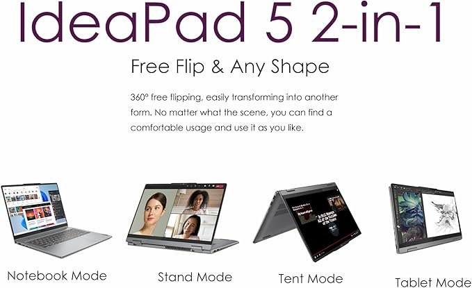 O Lenovo IdeaPad Flex 5i entrega uma experiência versátil com seu design dobrável 2 em 1 e tela WUXGA de alta resolução. Seu painel touchscreen de 14 polegadas permite uso como tablet, notebook ou modo tenda, ideal para apresentações, estudos e entretenimento. O visual moderno e o acabamento refinado dão um toque premium ao produto.
