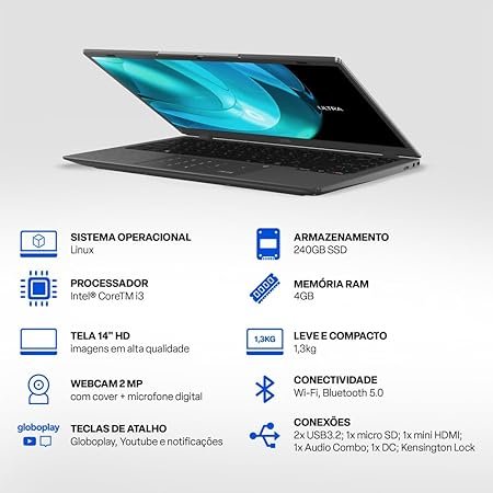 1x USB 2.0 Tipo-A, 1x USB 3.2 Gen 1 Tipo-A, 1x USB 3.2 Gen 1 Tipo-C, 1x HDMI 1.4, 1x combo áudio 3,5 mm, Wi-Fi 5, Bluetooth 5.1