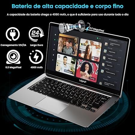 A bateria de 5.000 mAh promete boa autonomia para o uso leve e contínuo. Ainda assim, a falta de upgrade de RAM e de componentes internos reforça seu uso exclusivamente básico, ideal para quem precisa de uma máquina simples para estudar ou acessar a internet.