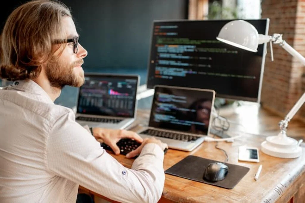 Homem programando em dois notebooks diferentes