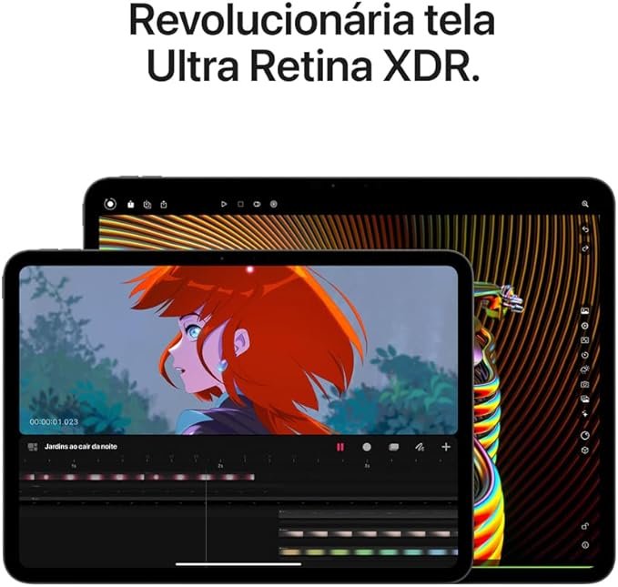 Em sua construção, e equipado com chip Apple M4, esse modelo proporciona desempenho de desktop em um corpo ultrafino. Seja para edição de vídeo em 4K, multi tarefas pesadas ou projetos com IA, a fluidez e velocidade do iPad Pro não decepcionam. Outro detalhe, o sistema iPadOS 17.5 amplia a produtividade com suporte a apps profissionais e acessos multi tela.