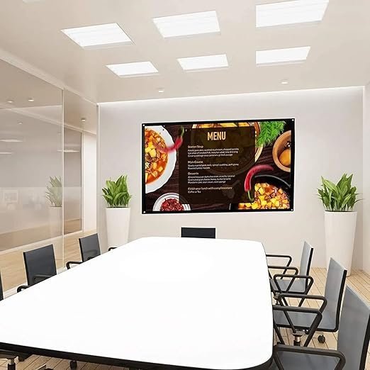 A tela de projeção branca é feita de tecido fosco de alta qualidade para fornecer a melhor superfície de visualização e também possui uma moldura de proteção preta para melhorar o foco e o alinhamento da imagem