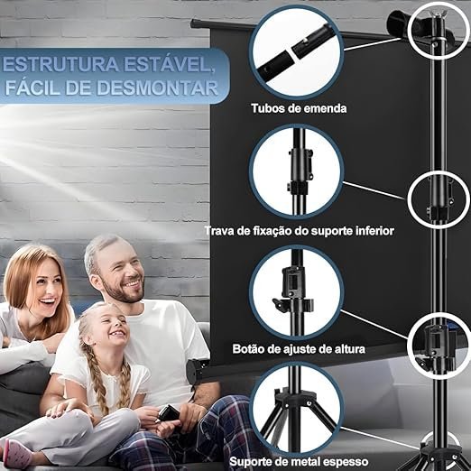 Com 100 polegadas e proporção 16:9, ela é perfeita para filmes, jogos e apresentações em grande escala. Seu tripé robusto é ajustável e estável, permitindo fácil ajuste de altura e uso tanto em ambientes internos quanto externos.