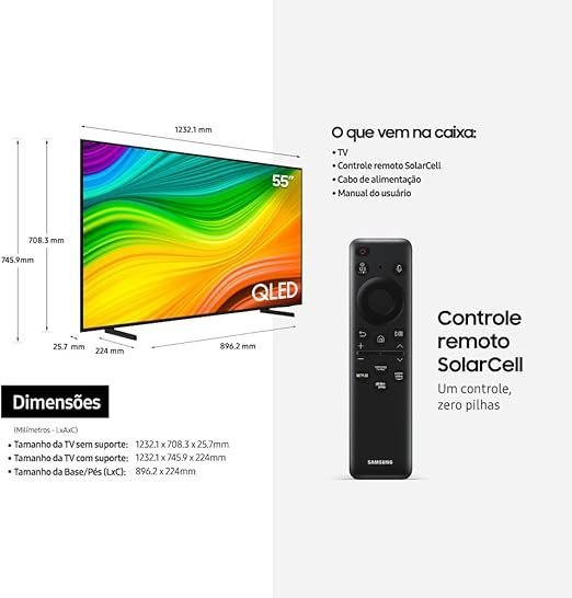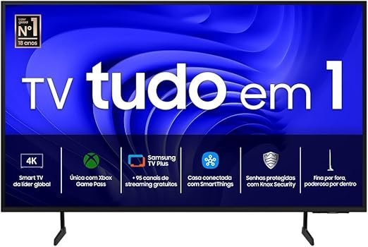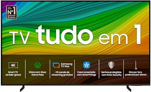 | Funções | Security Knox, vasto catálogo via Samsung TV Plus, design slim, economia de energia e Eco Sensor |